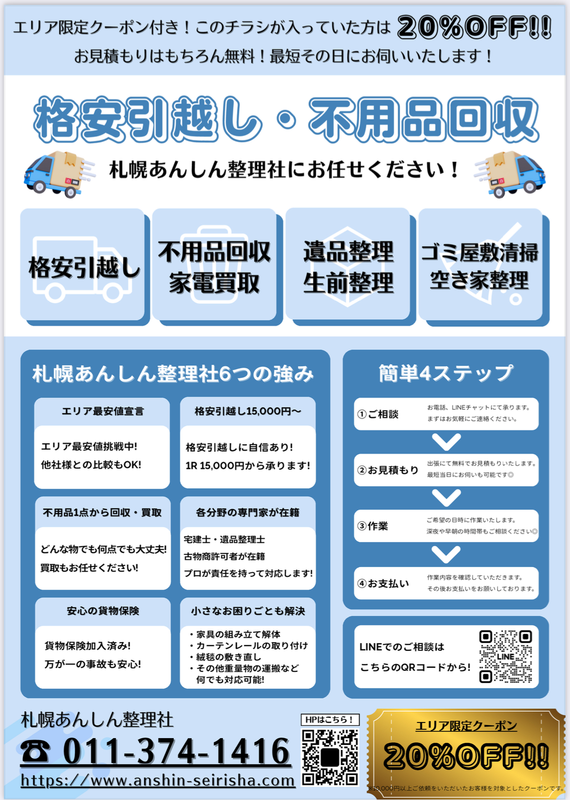 私たちは札幌を拠点に、「不用品回収」「格安引越し」「遺品整理・生前整理」「ゴミ屋敷清掃」など、暮らしに関わるお困りごとの解決をお手伝いしています。